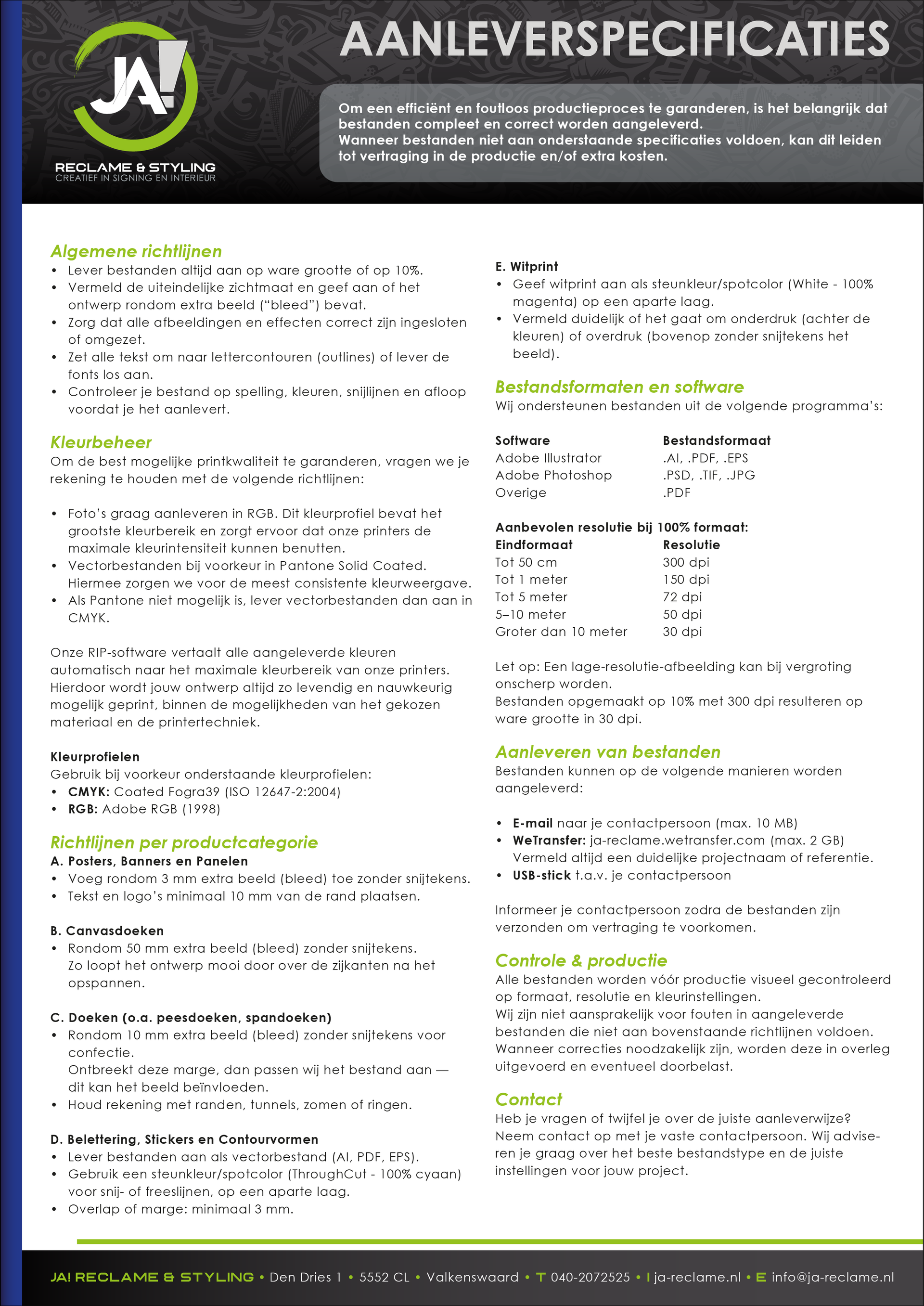 Op deze pagina vind je alle praktische informatie over onze aanleverspecificaties. Denk aan bestandsformaten, resolutie, kleurgebruik en afloop. Heb je vragen of twijfel je of je bestand goed staat ingesteld? Geen probleem – ons team kijkt graag met je mee en helpt je waar nodig.